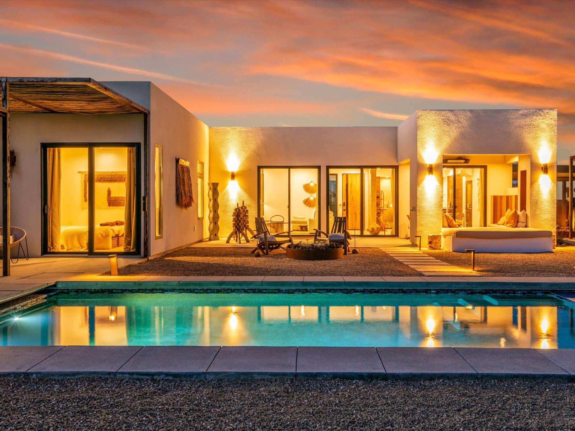 Escape to a private, gated 5-acre modern villa in Joshua Tree/Yucca Valley. This luxury hideaway blends indoor/outdoor living and is perfect for couples & families. Enjoy sweeping desert vistas, a sparkling pool & spa, a private yoga circle, an outdoor kitchen with Pizza oven, and a bocce court. Experience serene seclusion with easy access to Joshua Tree National Park. A perfect desert retreat for work or play.